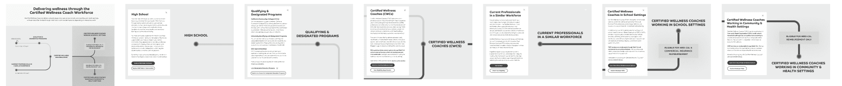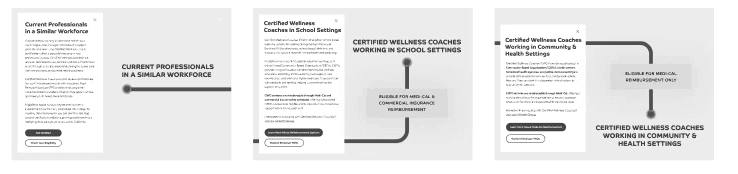 Even after the site launched we continued to iterate. We found holes in our user's understanding of the two main pathways to become a CWC (Certified Wellness Coach) and created a pathway map. The project's engineer and I would weekly meet as I began ideating on ways to make the experience more dynamic and "game-ify" the experience. We ultimately decided to create Lottie files for the line growth to show the user where they were in the experience and assigned each color to a milestone within the process.