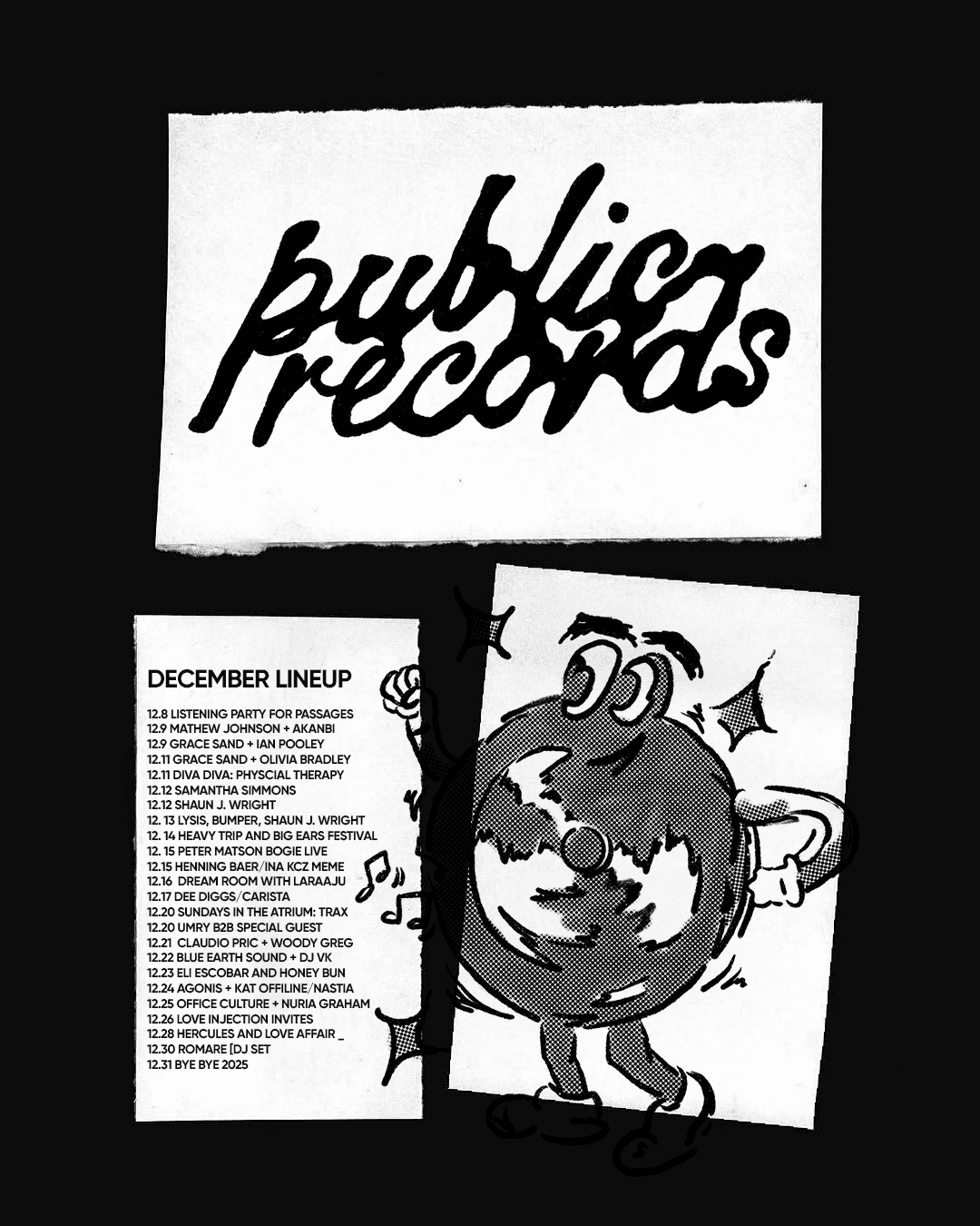 December was my final month of my creative monthly drops. This challenge pushed me creatively and allowed me to dive into new and different mediums while also pushing me to develop work on a deadline. Having the boundary of color and 3 posts was helpful in my process but I still found this project to be incredibly challenging as it also felt so boundless. For my last three posts I created a dec gif, a public records lineup poster, and finalized a piece of my mama playing her guitar in a lino-cut style.