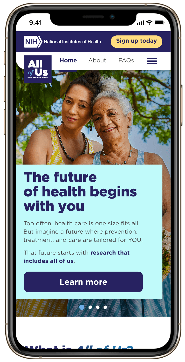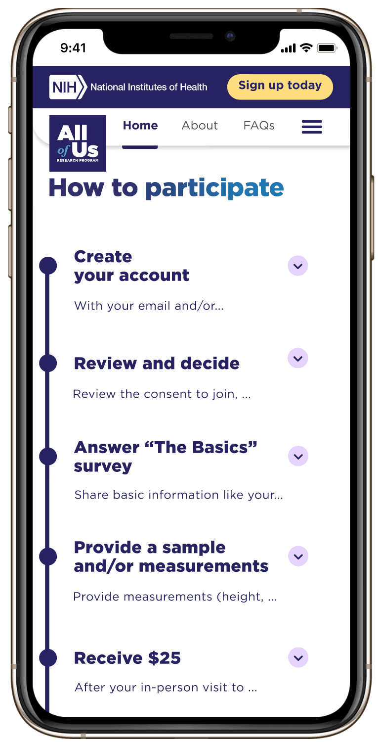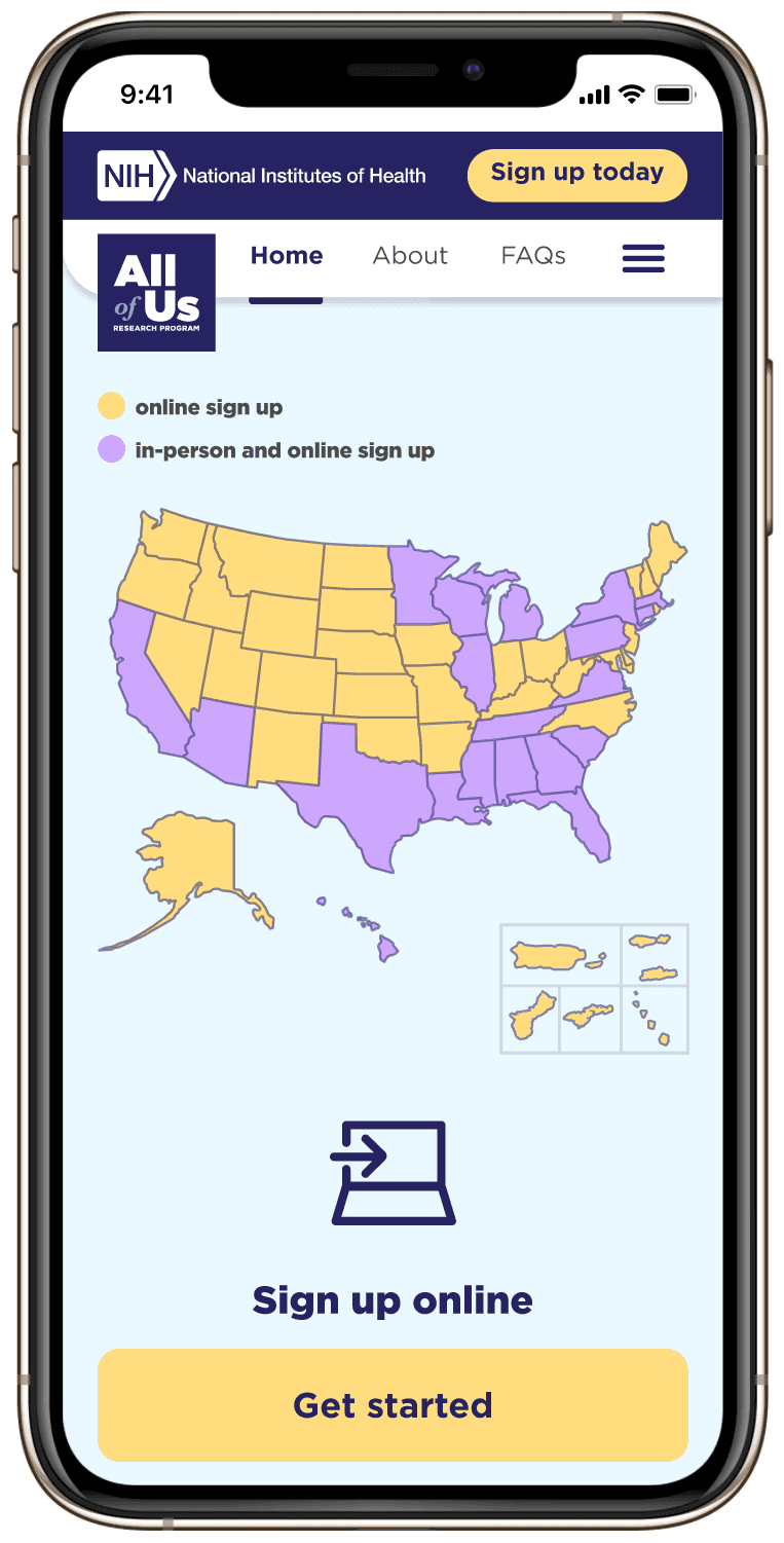 The landing page for the "Join" All of Us site needed to clearly encapsulate the entire mission into a single landing page while demonstrating the goal of the campaign and the steps to become a participant. I worked closely with a team of three user experience researchers, and one other user experience designer, to finalize this product.