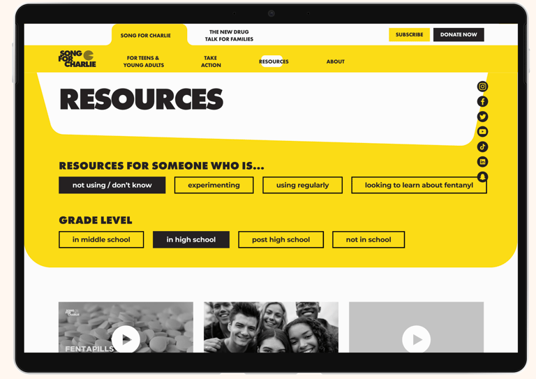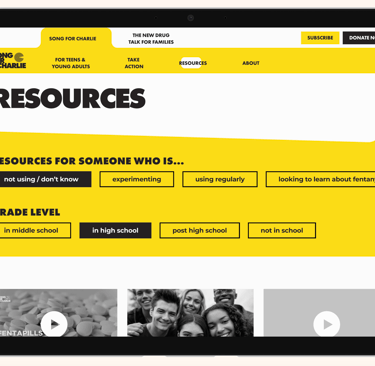 The Resources page on Song for Charlie stands out as a dynamic and user-centric hub, featuring advanced filters that allow visitors to tailor their exploration based on grade levels and the extent of drug usage.